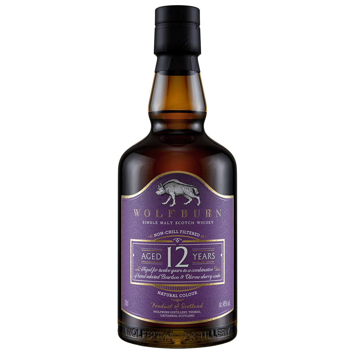 A permanent release from the Wolfburn distillery in the Highlands, first launched in 2025. Matured for 12 years in an equal combination of second-fill Oloroso sherry butts and ex-bourbon casks. Non-chillfiltered, naturally coloured and bottled at 46%. (Bottle size 750ml)