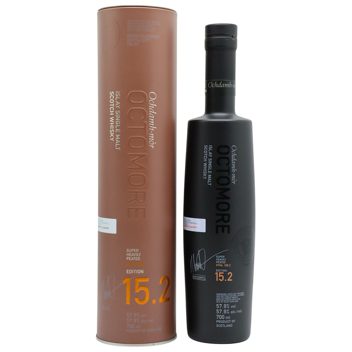 The 15th release in the super heavily-peated Octomore range from the Bruichladdich distillery on Islay. 15.2 is produced from 100% Scottish mainland concerto barley and then peated to 108.2ppm. Distilled in 2018 from the 2017 harvest and matured for 5 years, initially in a combination of second-fill wine casks and second-fill bourbon casks before being finished in first-fill Cognac casks for the remainder of its maturation. Non-chillfiltered, naturally coloured and bottled at a cask strength of 57.9%.